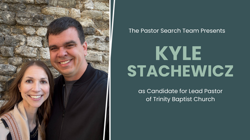The Pastor Search Team is honored to present and recommend Pastor Kyle Stachewicz for your consideration as our next Lead Pastor at Trinity Baptist Church. Kyle has been prayerfully evaluated through our extensive search process and has emerged as the candidate most aligned with the Pastor Profile (established initially from the congregational survey as the ideal standard to which all candidates have been measured). As the evaluation process has proceeded and personal encounters with Kyle have occurred, his character and biblical qualifications have been affirmed by all. A heart for Kingdom building and shepherding have stood out, along with impressive educational achievements, Lead Pastoral experience, and preaching technique emphasizing the gospel. His friendly and engaging personality combined with humble confidence seems the perfect fit to lead us into the next chapter of life at TBC. We’ve had a strong sense that as the Spirit has been drawing the PST closer to Kyle throughout the process, he has been drawn closer to us as well and has expressed a clear calling to serve here.