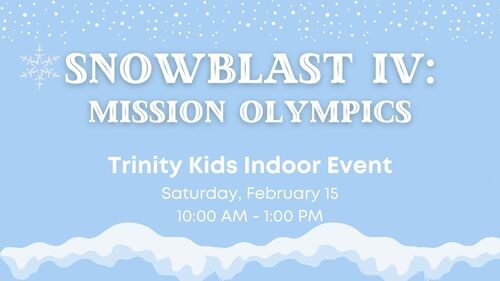 SNOWBLAST IV—MISSION OLYMPICS: SATURDAY, FEBRUARY 15, 10 AM—1 PM. Join us for fun and games in the Olympic style! A Trinity Kids Event. Ages PreK–5th Grade. Kids Kindergarten and under must have parental supervision for the entire event. Lunch will be provided. Please REGISTER for this FREE indoor event by Sunday, February 9th.
