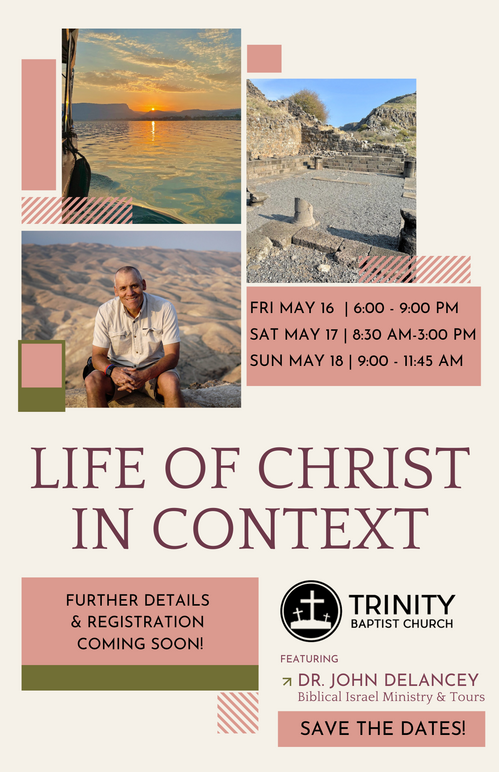 Trinity has scheduled Pastor John DeLancey to come lead us in a seminar called "LIFE OF CHRIST IN CONTEXT”. Pastor John (former pastor, archeologist, and Israel tour leader of 91 trips to Israel and 17 tours of Greece and Turkey) will be coming on: