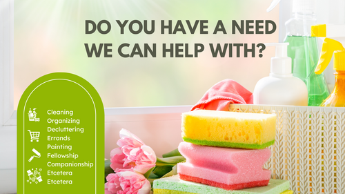 If you have a practical need or project where help would be a blessing—or are aware of a need within our congregation— we would love for you to let us know. Cleaning, Organizing, Decluttering, Painting, Running Errands, Having Coffee Fellowship, Etcetera.